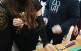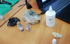 Na koniec spotkania uczniowie mogli zobaczyć i wziąć do ręki młotek geologiczny, fragmenty skał oraz ... ząb dinozaura znaleziony przez naszego gościa.